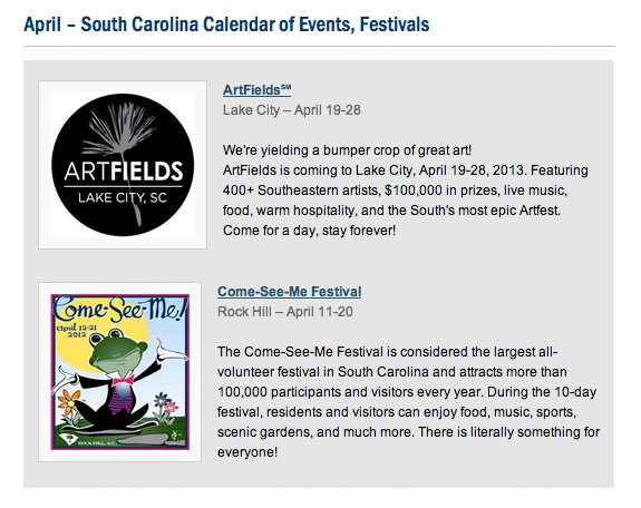 Standard Non-Commercial Listings Simple, chronological text link with short description available for most non-commercial events in South Carolina.