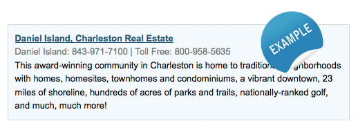 Select Your Ad Style – Rotating Real Estate Ad, Premium Real Estate Ad, or Image AdStyle 1 – Rotating Real Estate Ad – $300/YearA Rotating Real Estate Ad is an expanded listing that includes a link to your website, your phone number, your address (if desired), and a brief description of your company. Your expanded listing will always appear at the top of the page you choose, but the order it will appear in will rotate each time a new customer views the page. Please note that this link will not pass PageRank. Here is an example of how your Rotating Real Estate Ad would look: ![]() Style 2 – Premium Real Estate Ad – $900/YearA Premium Real Estate Ad differs from a Rotating Real Estate Ad in that it always appears at the top of all other ads – i.e., not in rotating order. It is always "front and center" and "above the fold." Please note that this link will not pass PageRank. A Premium Real Estate Ad also: