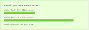 An alert reader sent us a copy of Town of Cheraw Resolution 7-92, which officially designates "chuh • RAW" as the correct pronunciation. It seems actual pronunciations still vary however (see poll results below). Here at SCIWAY, we like to call it "Churaw-Shuraw" so as to avoid any confusion. ;)